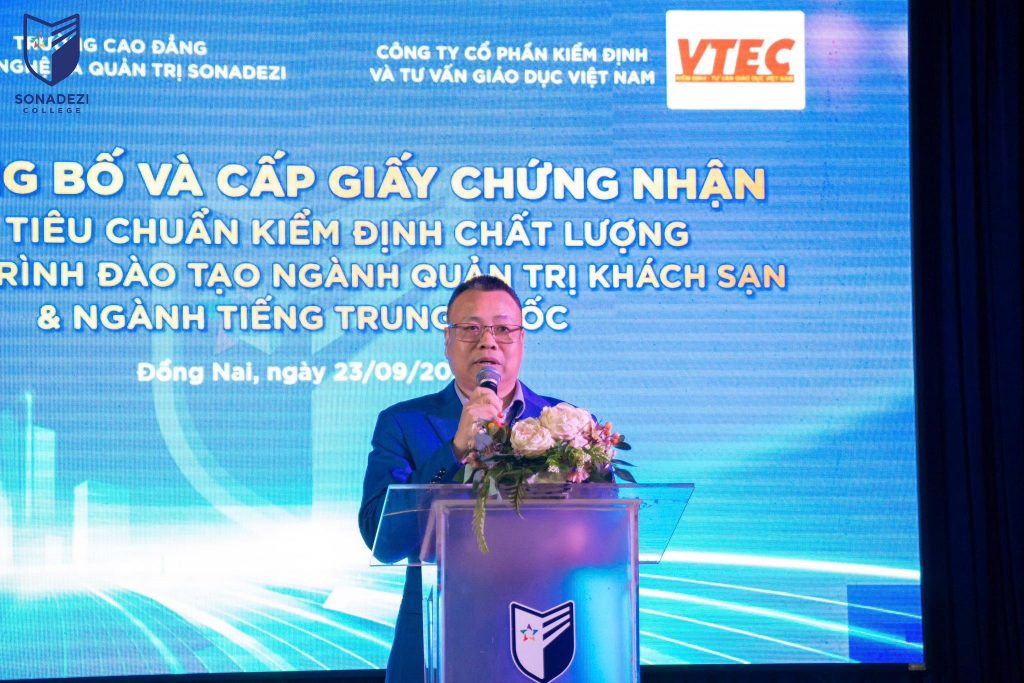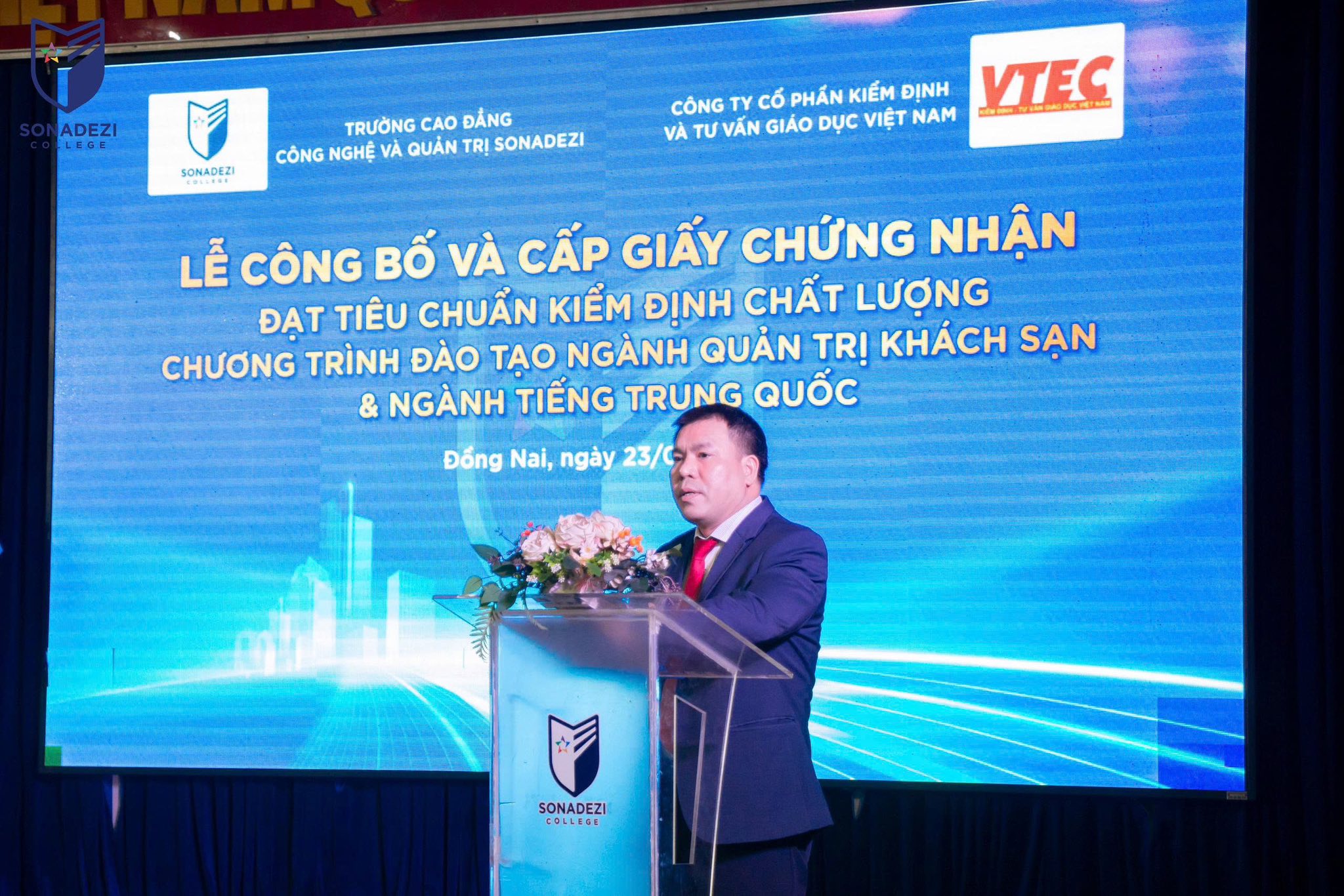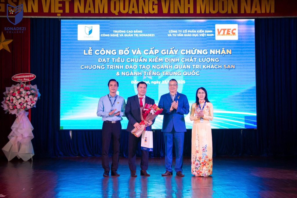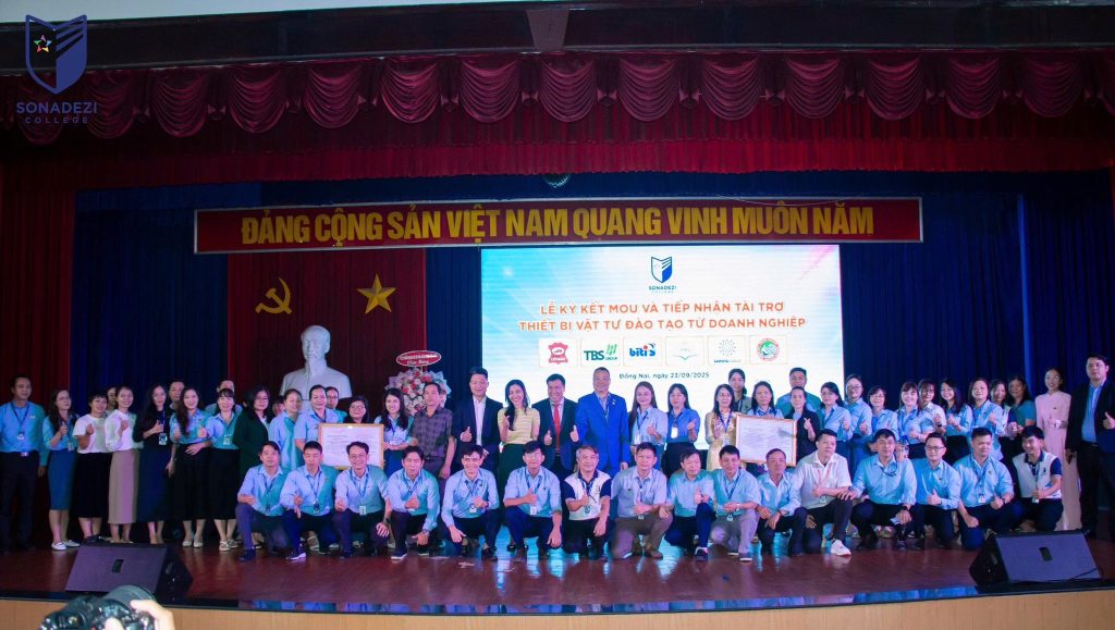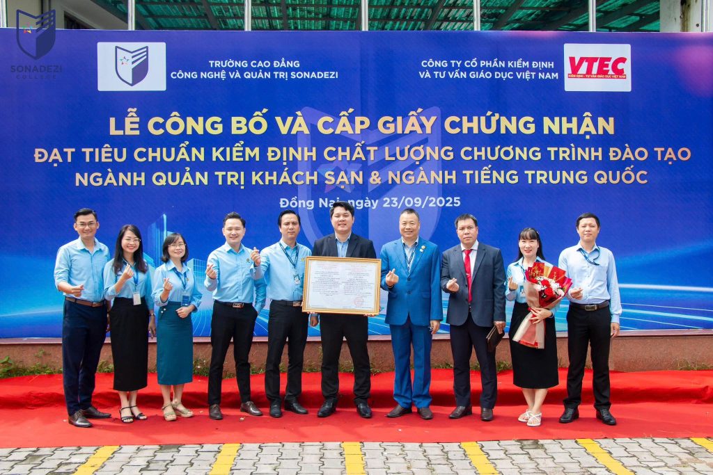 Sáng nay ngày 23/9/2025, Trường Cao đẳng Công nghệ và Quản trị Sonadezi đã long trọng tổ chức Lễ Công bố và cấp Giấy chứng nhận đạt tiêu chuẩn kiểm định chất lượng cho chương trình đào tạo Ngành Quản trị Khách sạn và Ngành Tiếng Trung Quốc; Lễ ký kết MOU và tiếp nhận thiết bị, vật tư đào tạo từ các doanh nghiệp tài trợ.